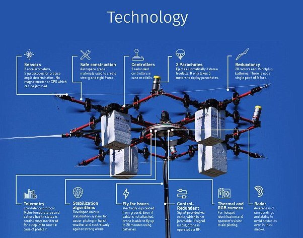 اما در بیشتر موارد این پهپاد می تواند به وسیله چند کابل که برق و آب را برای آن فراهم می کنند، چند ساعت متوالی پرواز کند.