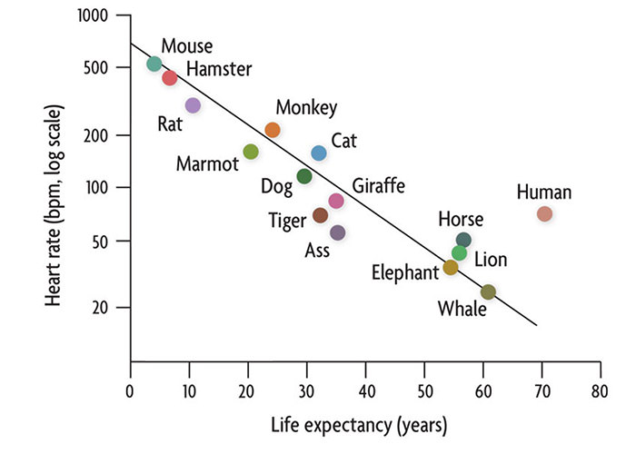 انسان دارای متوسط سرعت ضربان قلب حدود ۶۰ تا ۷۰ ضربه در دقیقه است. ما تقریبا ۷۰ سال عمر می‌کنیم و در طی این زمان قلب ما بیش از دو میلیارد ضربه خواهد زد. جوجه‌ها دارای نرخ بیشتر ۲۷۵ ضربان در دقیقه هستند و فقط ۱۵ سال زندگی می‌کنند. آن‌ها هم حدود ۲ میلیارد ضربه طی طول عمر خود خواهند داشت. ما به‌نظر خوش شانس می‌آییم؛ ضربان قلب یک وال حدود ۲۰ ضربه در دقیقه است و تنها کمی بیش از ما زندگی می‌کند. تعداد ضربان قلب کل او زیر یک میلیارد است. یک فیل طی ۷۰ سال عمر خود با تعداد ۳۰ ضربه در دقیقه در کل زندگی حدود یک میلیارد ضربه دارد. همستر کوچک دارای سرعت ۴۵۰ ضربه در هر دقیقه است و طول زندگی او سه سال است. کل ضربان های قلب او کمی زیر یک میلیارد است.