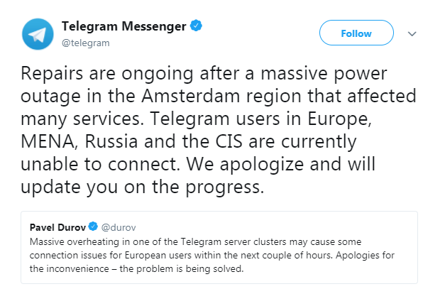 تلگرام مسنجر در توییتر نوشت: تعمیرات بعد از قطعی عظیم برق در منطقه آمستردام که بر بسیاری از سرویسها اثر گذاشته ادامه دارد. کاربران تلگرام در حال حاضر در اروپا، خاورمیانه، روسیه و منطقه کشورهای مشترکالمنافع قادر به برقرار ارتباط نیستند. ما عذرخواهی میکنیم و شما را در مورد اقدامات بعدی مطلع خواهیم کرد.