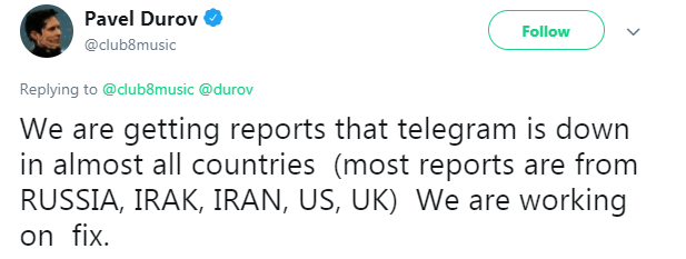 پاول دوروف رییس تلگرام نیز در توییتر خود به تسری این اختلالات به ایران اشاره کرده و گفت: باخبر شدیم که تلگرام در تقریبا همه کشورها دچار اختلال شده است(بیشتر گزارش ها مربوط به روسیه، عراق، ایران، آمریکا و بریتانیاست). ما در حال درست کردن اختلال هستیم.