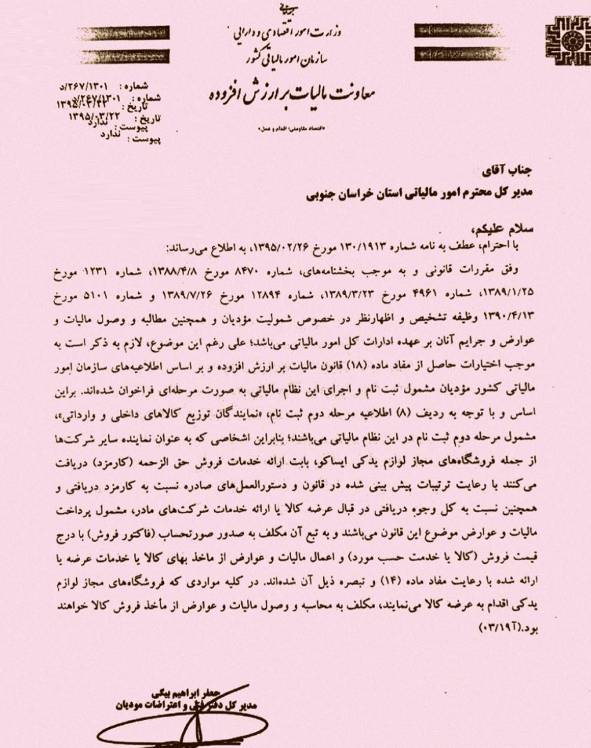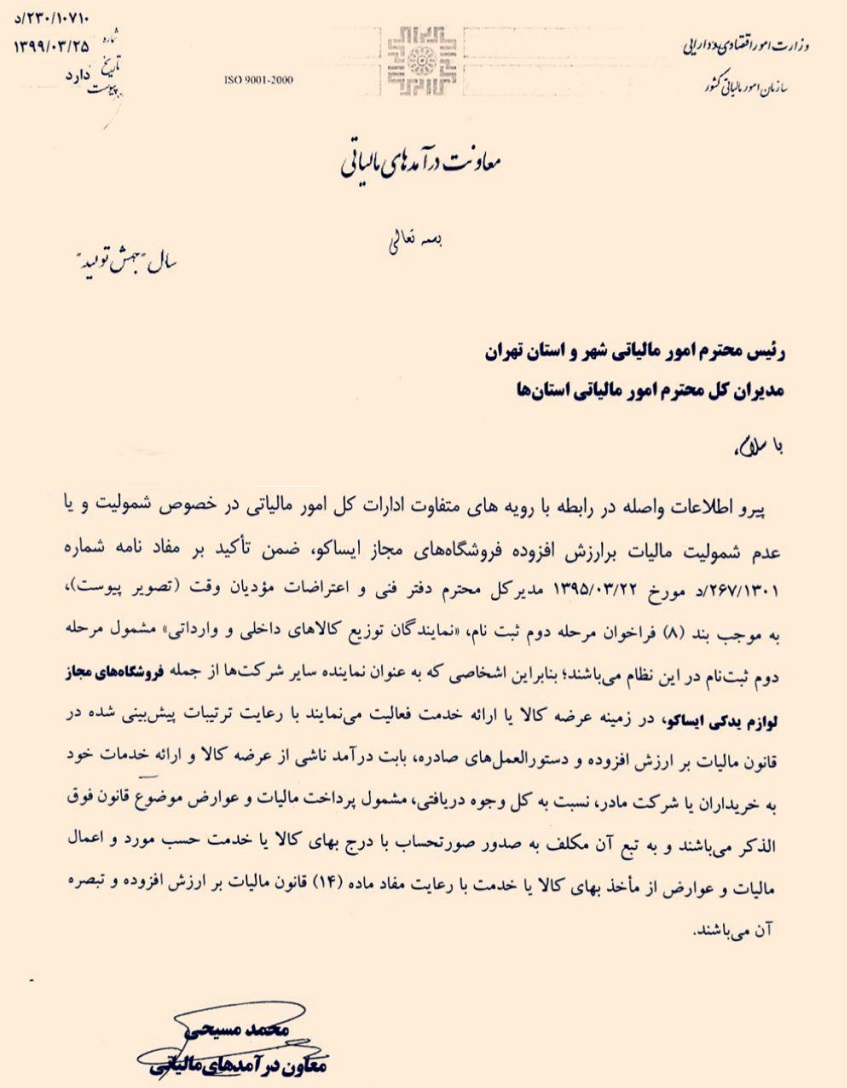 در این نامه آمده است: پیرو اطلاعات واصله در رابطه با رویه های متفاوت ادارات کل امور مالیاتی در خصوص شمولیت و یا عدم شمولیت مالیات برارزش افزوده فروشگاههای مجاز ایساکو، ضمن تأکید بر مفاد نامه شماره ۲۶۷/۱۳۰۱/د مورخ ۱۳۹۵/۰۳/۲۲ مدیر کل محترم دفتر فنی و اعتراضات مؤدیان وقت (تصویر پیوست)، به موجب بند (۸) فراخوان مرحله دوم ثبت نام، «نمایندگان توزیع کالاهای داخلی و وارداتی مشمول مرحله دوم ثبت نام در این نظام می باشند؛ بنابراین اشخاصی که به عنوان نماینده سایر شرکت ها از جمله فروشگاه های مجاز لوازم یدکی ایساکو، در زمینه عرضه کالا با ارائه خدمت فعالیت می نمایند با رعایت ترتیبات پیش بینی شده در قانون مالیات بر ارزش افزوده و دستورالعمل های صادره، بابت در آمد ناشی از عرضه کالا و ارائه خدمات خود به خریداران با شرکت مادر، نسبت به کل وجوه دریافتی، مشمول پرداخت مالیات و عوارض موضوع قانون فوق الذکر می باشند و به تبع آن مکلف به صدور صورتحساب با درج بهای کالا یا خدمت حسب مورد و اعمال مالیات و عوارض از مأخذ بهای کالا یا خدمت با رعایت مفاد ماده (۱۴) قانون مالیات بر ارزش افزوده و تبصره آن می باشند.