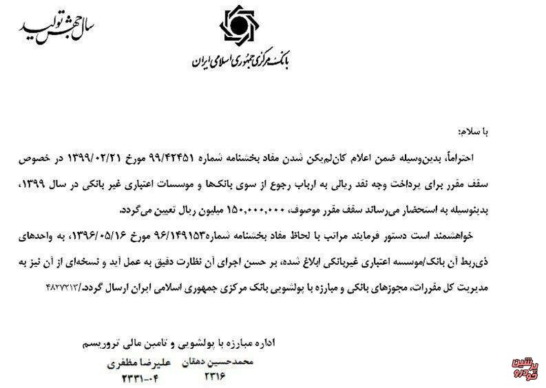 در این بخشنامه آمده است: احتراماً بدین وسیله ضمن اعلام کان لم یکن شدن مفاد بخشنامه شماره ۹۹/۴۲۴۵۱ مورخ ۲۱ اردیبهشت ۹۹ در خصوص سقف مقرر برای پرداخت وجه نقدی ریالی به ارباب رجوع از سوی بانکها و مؤسسات اعتباری غیربانکی در سال ۹۹، بدینوسیله به استحضار میرساند سقف مقرر موصوف، ۱۵۰ میلیون ریال تعیین میگردد.