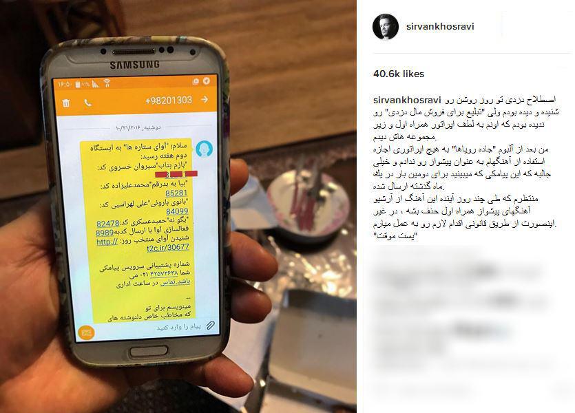 این خواننده سرشناس پاپ با انتشار ستی در اینستاگرامش نوشت: اصطلاح دزدی تو روز روشن رو شنیده و دیده بودم ولی "تبلیغ برای فروش مال دزدی" رو ندیده بودم که اونم به لطف اپراتور همراه اول و زیر مجموعه هاش دیدم.