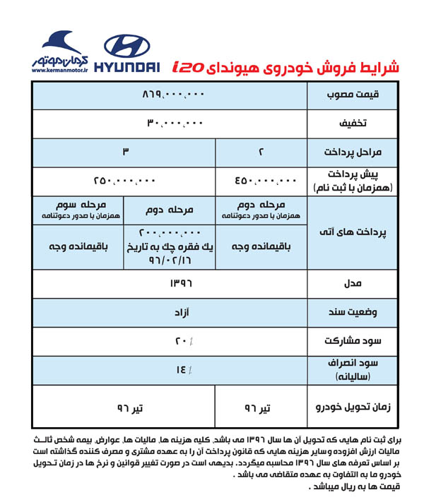در طرح پیش فروش جدید که جزئیات آن در جدول زیر آمده است، خریداران هیوندای آی20 محصول خریداری شده را در تیرماه96 دریافت خواهند کرد: