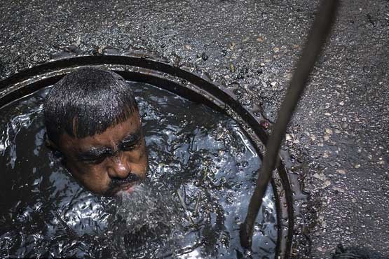 کارگران فاضلاب شهری داکا مجبورند در میان کثافات و لجن و بدون وسایل ایمنی و بهداشتی اولیه در مایعی تیرهرنگ شیرجه میروند تا راه عبور فاضلاب را باز کنند.