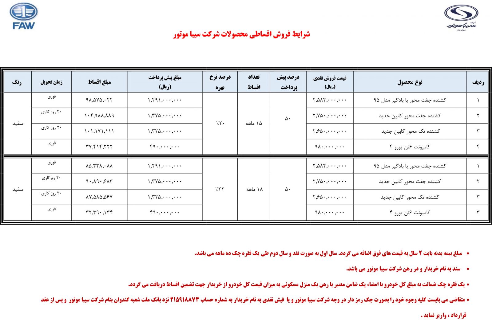 به گزارش خبرنگار پرشین خودرو، در شرایط اعلام شده ی شرکت سیبا موتور 50 درصد قیمت محصول به عنوان پیش پرداخت از خریداران دریافت می شود.