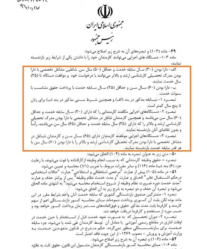 بر اساس ماده 103 جدید این لایحه شرایط بازنشستگی کارمندان دولت تغییر خواهد کرد. به عنوان مثال دستگاهها میتواننند با دارا بودن 30 سال سابقه خدمت و حداقل 50 سال سن کارمندان خود را بازنشست کنند. با مدرک تحصیلی بالاتر و با در خواست کارمند و موافقت دستگاه امکان خدمت تا 35 سال نیز وجود خواهد شد.