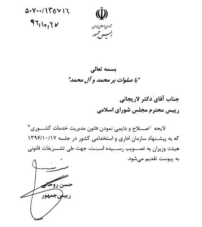 به گزارش پرشین خودرو به نقل از تسنیم، رئیس جمهور در روزهای اخیر لایحه اصلاح و دائمی نمودن قانون مدیریت خدمات کشوری را به پیشنهاد سازمان اداری و استخدامی، جهت طی تشریفات قانونی به رئیس مجلس شورای اسلامی تقدیم کرده است.