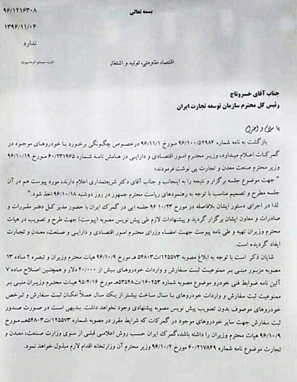 یه گزارش پرشین خودرو به نقل از تسنیم، رئیس کل گمرک ایران در مکاتبهای با خسرو تاج رئیس کل سازمان توسعه تجارت تاکید کرد، امکان ترخیص خودروهای در گمرک مانده بدون مصوبه هیئت دولت وجود ندارد. به این ترتیب ترخیص خودروهای در گمرک مانده با نامه گمرک ایران به وزارت صنعت، معدن و تجارت منتفی شد. حدود یکماه پیش رئیس سازمان توسعه تجارت ایران در پیشنهادی به وزیر صنعت، معدن و تجارت خواستار تعیین تکلیف خودروهای موجود در گمرکات و مناطق ویژه اقتصادی و آزاد تجاری شده بود.