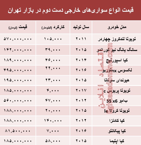 پرشین خودرو: آنچه در زیر میآید قیمت روز انواع خودروهای خارجی دست دوم در سطح بازار تهران است سواریهای زیر ممکن است به دلایل مختلف از جمله تصادف و وجود لکه رنگ و یا فروش فوری خودرو کمتر از قیمتهای رایج در بازار خرید و فروش خودروهای دست دوم عرضه شود.