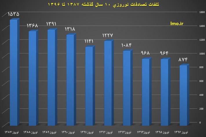 در نوروز سال ۱۳۹۶، (۲۵ اسفند ۹۵ تا ۱۵ فروردین ۹۶) ۸۷۴ نفر یعنی به طور متوسط روزانه ۴۱۰۶ نفر در حوادث رانندگی کشته شدهاند، این تعداد نسبت به متوسط روزانه ایام مشابه در سال گذشته که آمار تلفات ۴۸.۲ نفر بوده، ۱۳.۷ درصد کاهش یافته است.