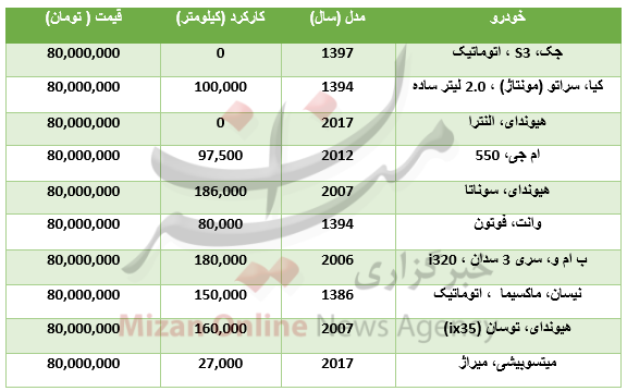 به گزارش پرشین خودرو با ۸۰ میلیون تومان امکان خرید خودروهایی مانند ام جی ۵۵۰، کیا سراتو، هیوندای سوناتا، وانت فوتون، نیسان ماکسیما، میتسوبیشی میراژ و موارد مشابه را دارید.