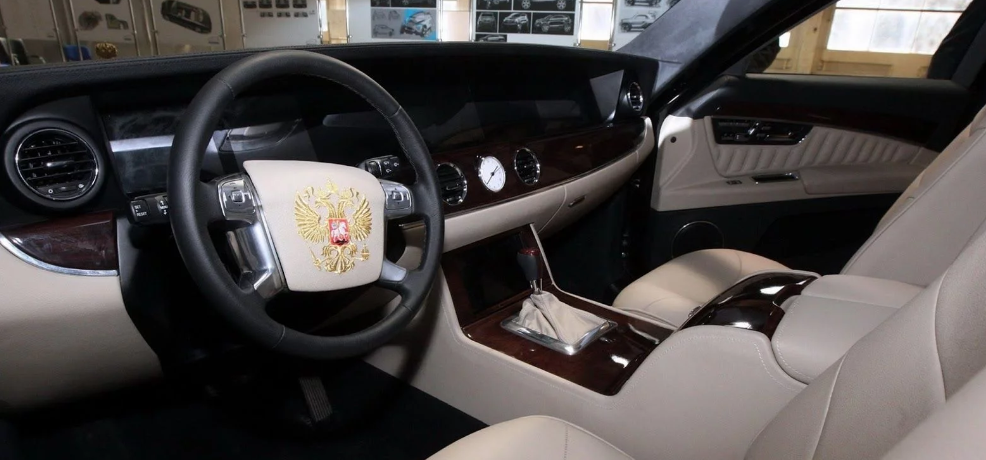 لیموزین ریاست جمهوری روسیه بسیار لوکس طراحی شده و بهترین نوع چرم، چوب و نوارهای متالیک در آن موج میزند. در بخش عقبی لیموزین نیز شاهد 4 صندلی رودررو هستیم که توسط کنسولها از هم جدا شدهاند.