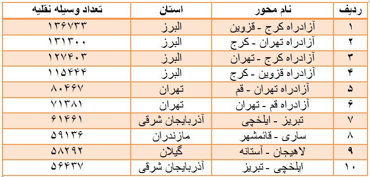 تردد انواع تریلر و کامیون در مسیر شرق به غرب از ساعت ۰۷:۰۰ الی ساعت ۲۴:۰۰ تاریخهای ۲۸ و ۹۶/۱۲/۲۹ و همچنین تاریخهای ۹ و ۹۷/۰۱/۱۰ و در مسیر غرب به شرق نیز از ساعت ۰۷:۰۰ الی ساعت ۲۴:۰۰ تاریخهای ۴، ۱۰، ۱۲ و ۹۷/۰۱/۱۷ ممنوع میباشد.