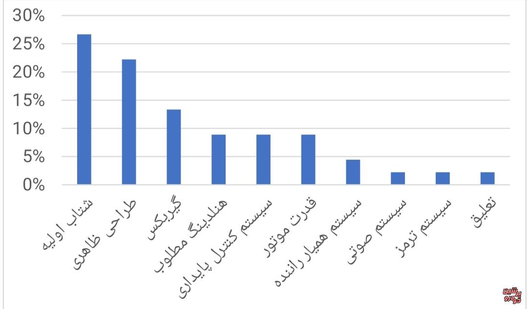 همچنین شرکتکنندگان نظرسنجی، در بخش مربوط به برجستهترین ویژگی FX، به ترتیب موارد «شتاب اولیه»، «طراحی ظاهری»، «گیربکس»، «هندلینگ» و «عملکرد سیستم کنترل پایداری» را بهعنوان مهمترین ابعاد FX انتخاب کردند.