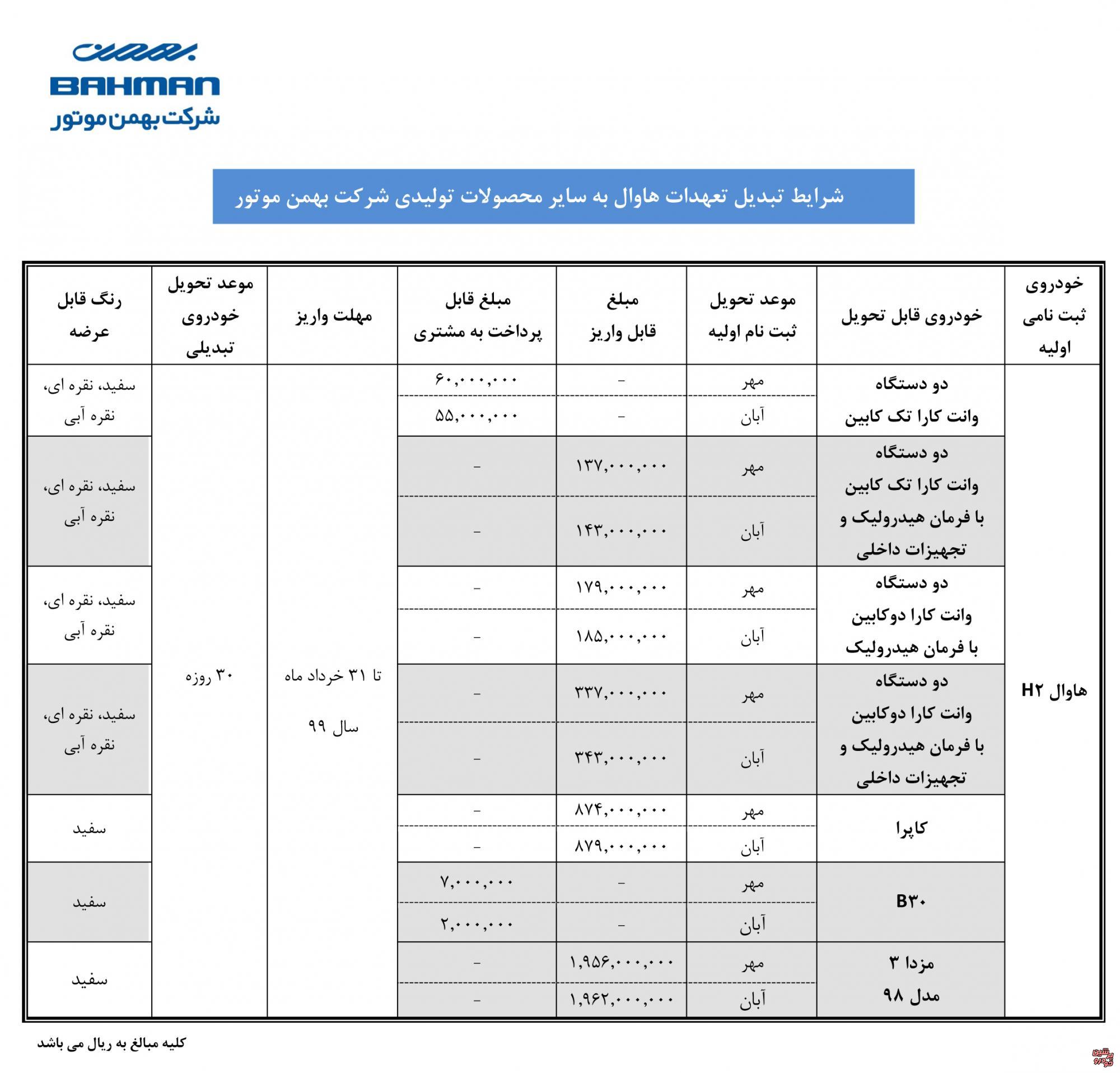 با توجه به درخواست مجدد مشتریان و عدم امکان ارائه خودرو هاوال به دلیل قطع همکاری شریک تجاری در تامین قطعات، شرایط تبدیل تعهدات هاوال به سایر خودروها در اطلاعیه ای از سوی شرکت بهمن موتور صادر و اعلام شده است: