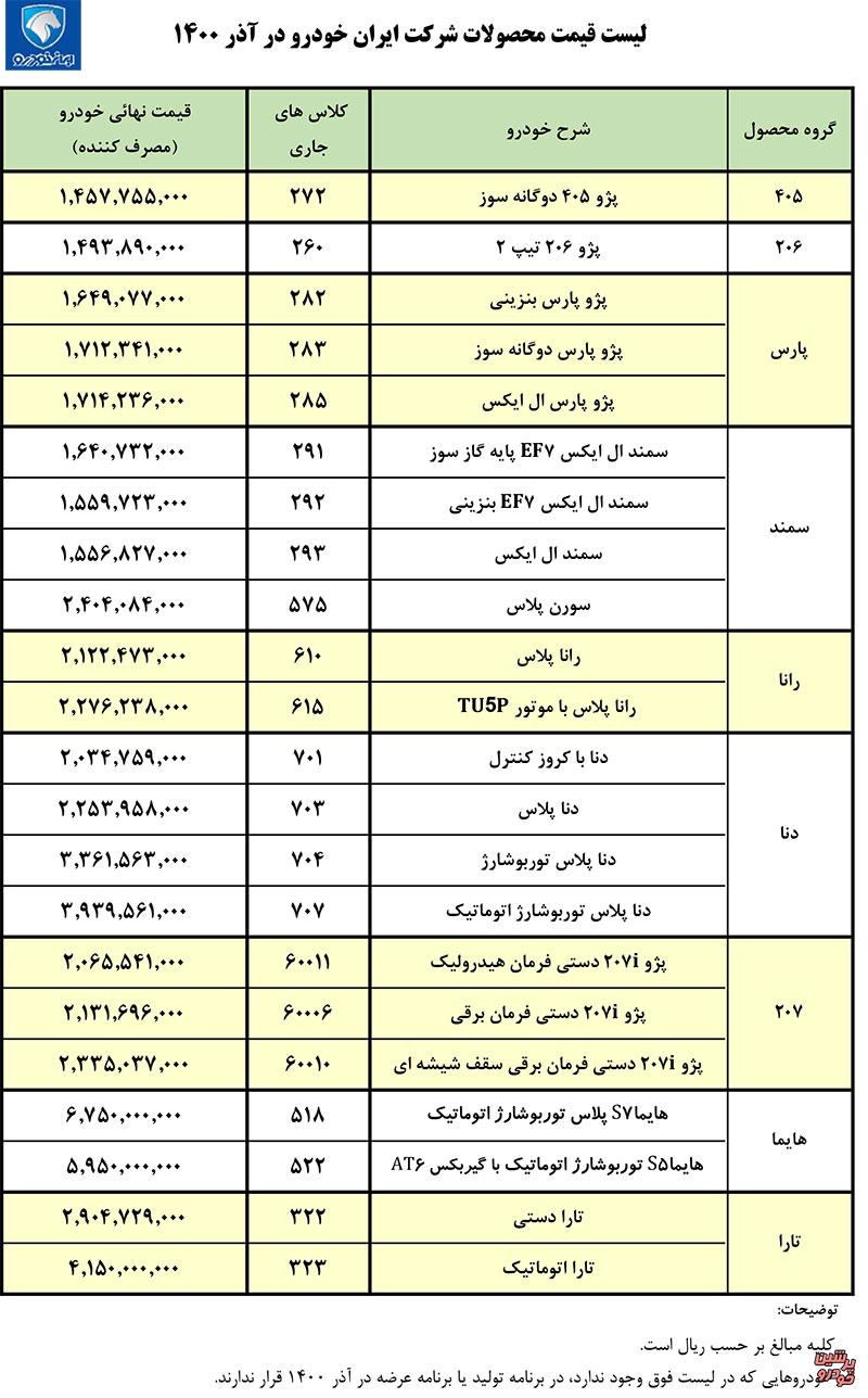 به گزارش خبرنگار پرشین خودرو، به دنبال مجوز افزایش قیمت برای محصولات شرکت ایران خودرو، قیمت تمام محصولات تولیدی این شرکت به شرح جدول زیر برای آذرماه 1400 اعلام شده است: