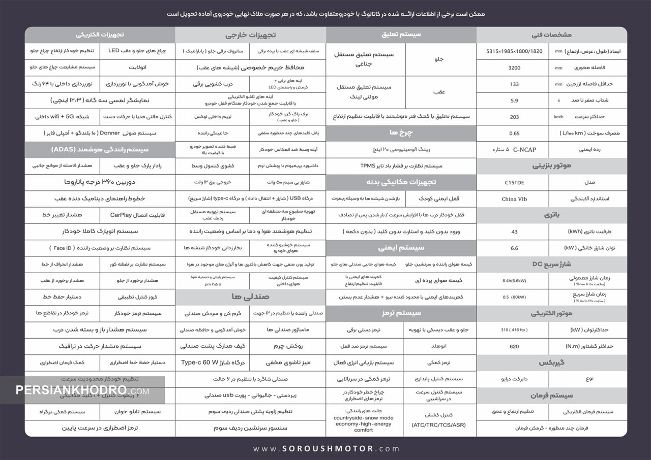 سیستم تعلیق جلو بصورت مستقل جناغی و تعلیق عقب از نوع مستقل مولتی لینک می باشد. این محصول جدید سروش موتور از رینگ آلومینیومی ۲۰ اینچ بهره می برد.