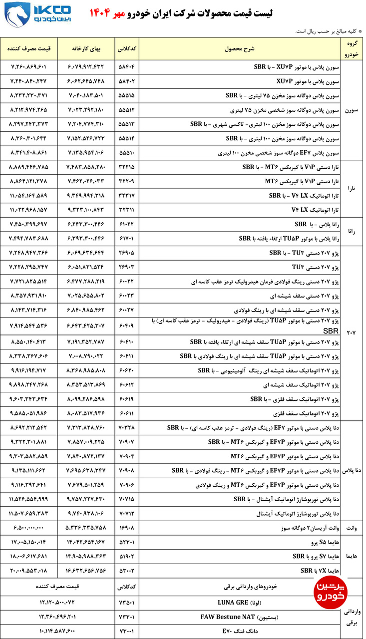 به گزارش پرشین خودرو، قیمت جدید محصولات ایران‌خودرو در مهرماه ۱۴۰۴ به شرح جدول زیر می باشد: