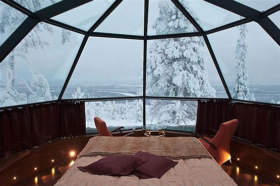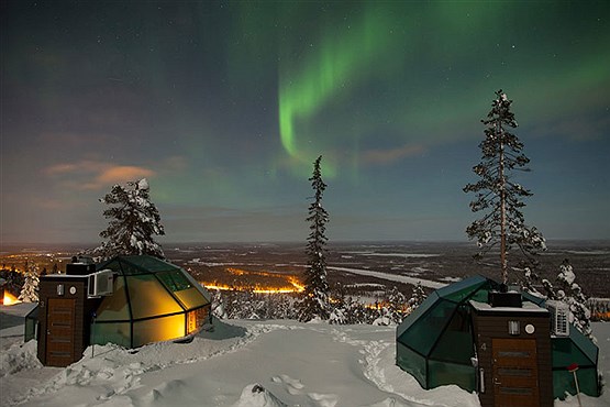 لذت تماشای شفق قطبی، زندگی چندروزه در یکی از سردترین نقاط زمین. هتل گلدن کراون لوین اگلوت در شهرستان لوی در کشور فنلاند قرار دارد. هتلهای گلدن کراون در یکی از بلندترین کوههای شمال فنلاند ساخته شده است و ساختار هتلها به صورت خانههای نیمکره تمام شیشهای است.