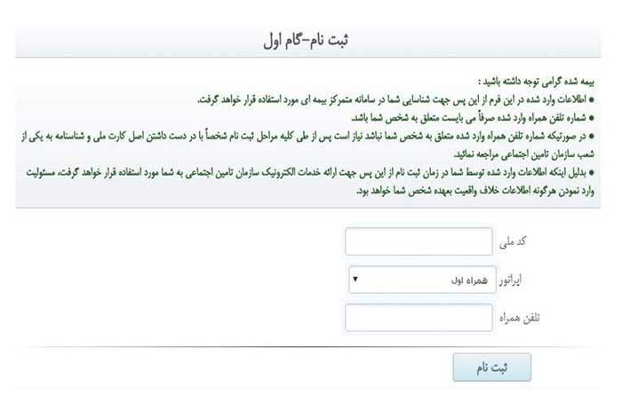 در این بخش در صورتی که ثبت نام نکردهاید باید روی گزینه ثبت نام کلیک کنید و بعد از کلیک وارد پنجره جدیدی میشوید که از شما میخواهد اطلاعات درخواستی را وارد کنید؛ در کادر نخست کد ملی و در کادر بعدی اپراتوری خط موبایلتان را انتخاب (برای مثال همراه اول، ایرانسل، رایتل) و در کادر سوم نیز شماره همراه خود را وارد میکنید و سپس روی گزینه ثبتنام کلیک کنید: