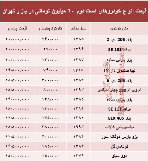 خودروهای 20 میلیون تومانی در بازار +جدول