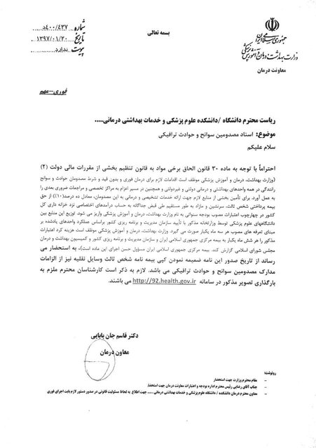 به گزارش پرشین خودرو به نقل ازایسنا، بر اساس آئین‌نامه اجرایی ماده ۹۲ قانون برنامه چهارم توسعه، وزارت بهداشت مکلف شده است که نسبت به درمان فوری و بدون قید و شرط مصدومین سوانح و حوادث رانندگی در خدمات بهداشتی و درمانی اقدام کنند. همچنین در این ماده اعلام شده که به منظور تامین منابع لازم برای ارائه خدمات فوق، ۱۰ درصد حق بیمه شخص ثالث، سرنشین و مازاد توسط شرکت‌های بیمه تجاری وصول و به حساب درآمدهای اختصاصی وزارت بهداشت نزد خزانه‌داری کل واریز و هزینه‌های درمان کلیه مصدومان ترافیکی، جاده‌ای و رانندگی از محل وجوه واریز شده به این حساب و سایر منابع موجود، پرداخت شود. توزیع این منابع نیز بر اساس عملکرد هر یک از سازمان‌های بیمه‌گر پایه توسط وزارت بهداشت هر شش ماه یکبار انجام خواهد شد.