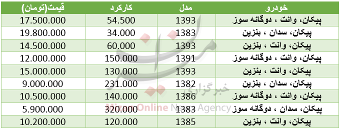 قیمت برخی از مدل های خودرو پیکان به شرح زیر است: