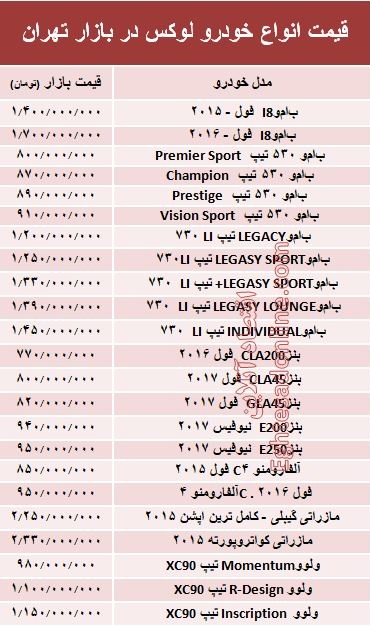 https://persiankhodro.com/xPMT۲۳ اردیبهشت ۱۳۹۷ - ۱۴:۲۳ کد مطلب 95495 آرشیو اخبار قیمت برخی خودروهای لوکس در بازار+جدول کد مطلب 95495 ۲۳ اردیبهشت ۱۳۹۷ - ۱۴:۲۳ 95495 پرشین خودرو: آنچه در زیر میآید قیمت روز انواع خودروهای لوکس و وارداتی در سطح بازار پایتخت طی اردیبهشت ماه 97 است که ممکن است تا 5 درصد در مناطق مختلف تهران دارای نوسان باشد. کد مطلب 95495 برچسبها بازار خودرو خودرو خودرو لوکس قیمت خودرو کاهش قیمت خودرو