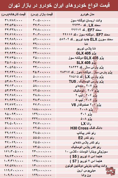 آنچه در زیر می‌آید قیمت روز انواع سواری­های ایران خودرو در سطح بازار پایتخت طی خرداد ماه 97 است که ممکن است تا 5 درصد در مناطق مختلف تهران دارای نوسان است.